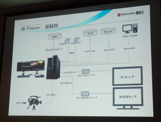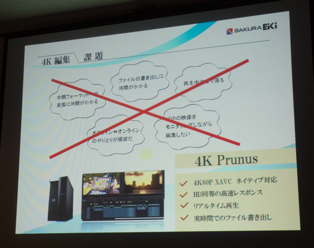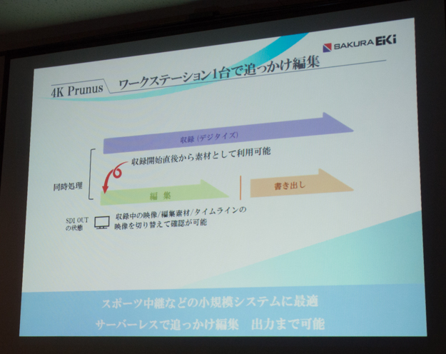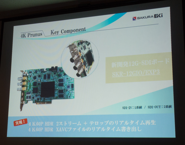 また、さくら映機で8Kのリアルタイム編集機を昨年のリオオリンピックで実戦投入しており、そこで開発した機能を今回の4K Prunusにダウンサイジングした結果、4K60p HDR 2ストリーム+テロップのリアルタイム再生、または4K60p HDR XAVCファイルのリアルタイム書き出しが実現可能になったという。