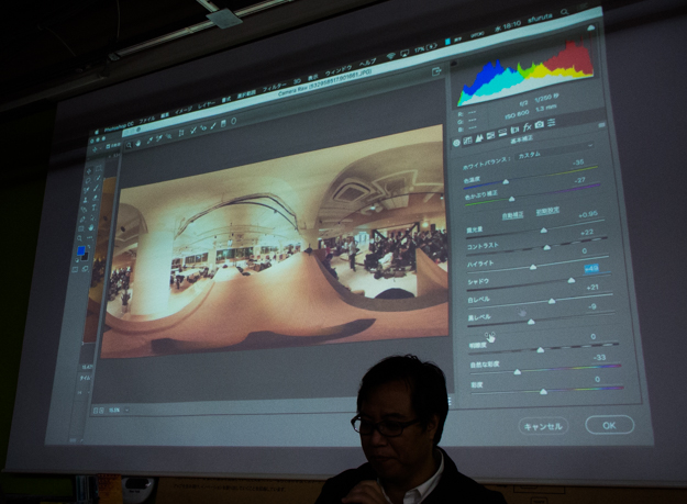 次に、2017年10月のアップデートでパノラマ編集が可能になったPhotoshopの新機能を紹介。リコーTHETAの360°で撮ったエクレクタンギュラー形式の静止画を読み込み、自動補正での調整や彩度の調整、色温度を若干調整したりできるようになった。また、暗いシーンで撮影をするとどうしても暗部のノイズが気になる場合があるが、メインメニュー→「フィルター」→「Camera Rawフィルター」の「ノイズ軽減」でノイズを抑えるという。
