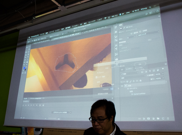 続いて、メインメニューの「3D」メニュー「球パノラマ」→「選択したレイヤーから新規パノラマレイヤーを作成」の選択で、エクレクタンギュラー形式をPhotoshop上でパノラマとして表示できることを紹介。撮影クルーや不要なオブジェクトが写り込んでいて消したいという場合はPhotoshopの通常の画像編集と同じで、領域を選択ツールで選んでメインメニューの「編集」→「塗りつぶし」→「内容」→「ホワイト」や「コンテンツに応じる」で自動的に消すことができるという。