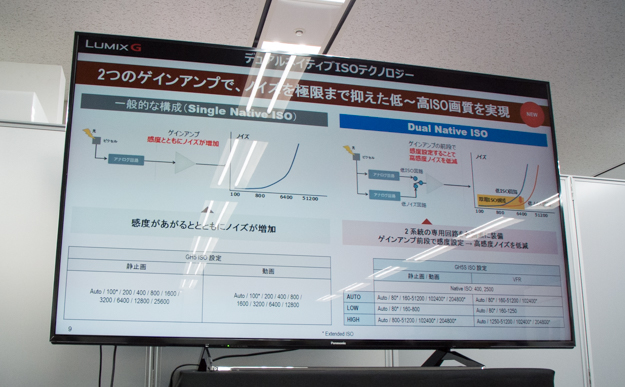 また、業務用のカメラのVARICAMやAU-EVA1ではお馴染みの機能「デュアルネイティブISOテクノロジー」の搭載も高感度のキーとなっている。一般的なシングルネイティブISOでは、1つのアナログ回路でゲインアップを構成しており、ISO感度を上げると一緒にノイズも上がってしまう。デュアルネイティブISOでは、2つのアナログ回路を搭載しており、低ISO感度まで引っ張れたり、高感度ではノイズを抑えることができる。また、高感度ISO6400以上においても出来る限り、ノイズを抑えた品位を抑えた画質を実現している。