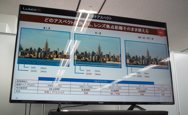 また、マルチアスペクトも特徴で、GH5Sはイメージサークルに対して一回り大きなイメージセンサーを採用。ボディ内手ぶれ補正の搭載を見送った分、そのスペースをうまく有効活用したイメージセンサーを採用することにより、4:3や3:2、16:9、Cinema4Kの17:9といったこの画角でもレンズの焦点距離をそのまま使用することを実現している。