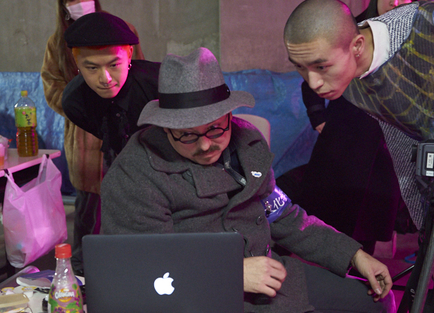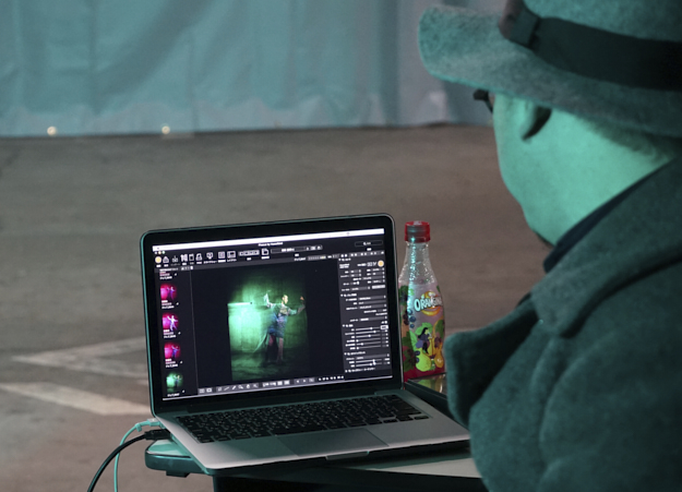 モニターを確認するデザイナーで院生のRickyy Tsztung Wong氏(左)とカメラマンのデレック槙島氏(中央)。撮影結果はテザー撮影により即Macで確認できる