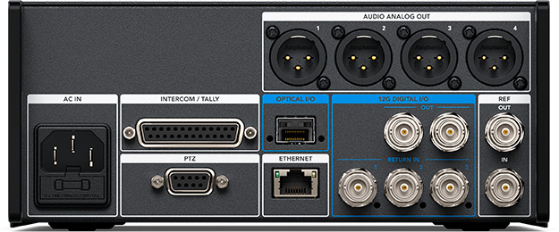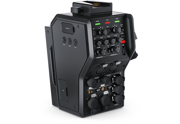 多くの場合、スタジオカメラは背面から操作するため、カメラの背面に取り付けて使用するCamera Fiber Converterには、リターンフィード、デュアルインターコム、プログラムオーディオのミックス機能、録画ボタン、フォーカス/アイリスコントロール、ヘッドセットコネクター、オーディオなどのコントロールが搭載されている。Blackmagic Studio Viewfinderなどのアクセサリが取り付けられるように、上部にVマウントプレートも搭載している。