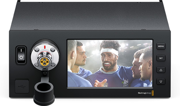 Blackmagic Camera Fiber Converterは、超堅牢なメタルデザインを採用しており、URSA Broadcastカメラと完璧にマッチする。フルサイズのテレビ業界標準コネクター(ダストキャップ付き)を搭載。また、上面にはBlackmagic Studio Viewfinderを追加するためのVロックマウントが付いている。Blackmagic Studio Fiber Converterはラックマウント可能なデザインで、フロントパネルには5インチのLCDおよび光ファイバーコネクターを搭載しているため、リモートカメラを簡単に接続して瞬時にフィードを確認可能。