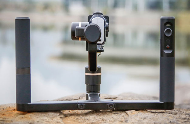 別売りのデュアルハンドル「FYG5GSDHK」(税別13,500円、2018年3月下旬以降発売予定)を装着することで、両手持ちのジンバルにすることもできる。交換は工具レス。その他にも、スマートフォンアプリ「FeiyuON」と連動して拡張機能の仕様が可能。バッテリー駆動は7時間、microUSB充電となっている。