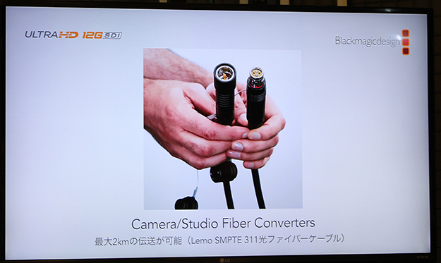 ファイバーケーブルを使用することで長距離伝送が可能になるだけでなく、ケーブルの中に映像やトークバック、タリー、カメラコントロールなどの信号と、電源を含んでおり、1本のSMPTEケーブルで双方向伝送が可能なためケーブルがシンプルになるとしている。