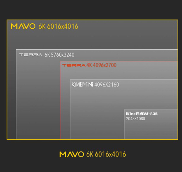 MAVOは、24×16mmの3:2アスペクト比CMOSイメージセンサーを搭載。解像度は6016×4016で、標準ISOは800、14段階以上のダイナミックレンジを実現している。S35フォーマットでは、6K DCIで50fps、6K Wideで66fps、4K HD Wideで100fpsのハイスピード撮影も可能。