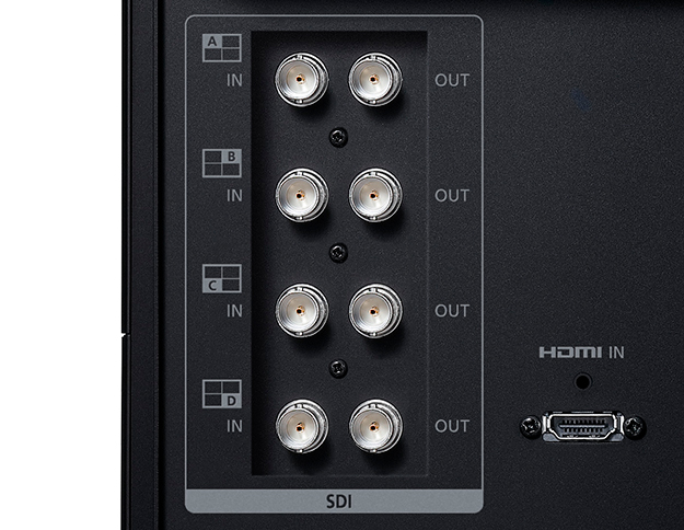 DP-V2421/V1711は、12G-SDI端子を搭載した業務用4Kディスプレイ。12G-SDI端子(IN/OUT各4系統)の搭載により、3G-SDI端子搭載の4KディスプレイではSDIケーブルを4本必要としていた4K/60P映像の送受信が、12G-SDI対応ケーブル1本で可能となった。12G-SDI対応ケーブル(4本)の接続により、4K/60Pの映像信号を4系統入力でき、1つのディスプレイで信号を切り替えながら複数の4K映像を確認することが可能。