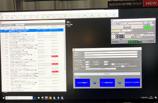 8K/4K対応字幕制作システム「NeON-SHV」は、従来機のNeON-VIIIと同等の操作性や機能のまま、スーパーハイビジョン放送(8K/4K)およびハイビジョン放送(2K)放送用字幕データに対応。なお、NeON-SHVは日本放送協会との共同開発製品。開発展示として、クラウドAIを活用した字幕の自動生成のデモを行っていた