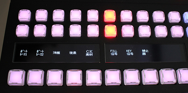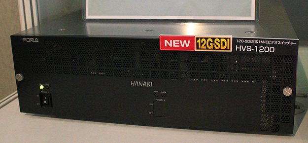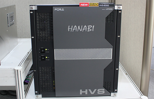 12G-SDI対応ビデオスイッチャ-「HVS-6000」。標準構成では24入力/24出力、16AUX出力の2M/Eビデオスイッチャーだが、12RUの筐体に入力用スロット5基と入出力用スロット2基を持ち、8系統単位で入出力を増設できる。また、M/E用スロットへM/E機能拡張カードを追加することで、最大80入力/32出力または64入力/48出力の3M/Eビデオスイッチャーへ拡張可能