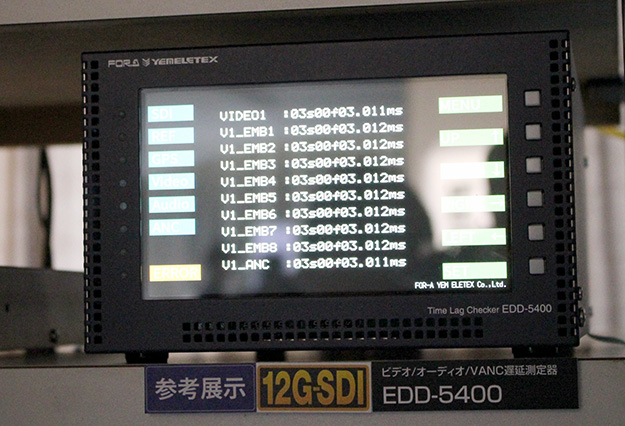 朋栄YEMエレテックスの4K対応映像/音声遅延測定器「EDD-5400」。テストタイムコードを使用し、映像遅延時間、音声遅延時間、音声チャネル間の相対遅延時間差、および映像音声相対遅延時間差を測定する