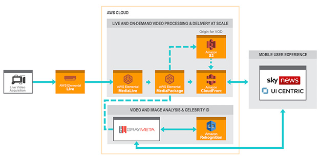 到着するゲストを映していくカメラフィードは、セントジョージチャペルの近くに設置した屋外放送中継車に取り込まれる。車内のAWS Elemental Liveエンコーダーからクラウドへ打ち上げ、AWS(Amazon Web Services)のクラウド・メディアワークフローに取り込み、マルチスクリーン視聴の最適化とキャッチアップ機能を含むオンデマンド動画アセットを生成。そして米GrayMetaデータ分析プラットフォームと米Amazon Rekognitionのビデオと画像解析サービスを組み合わせ、ゲストのリアルタイム識別と関連情報のタグ付けを行っている。