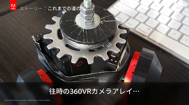 最初に、イマーシブストーリーテリングの提唱者であり360°VRビデオ業界に変革をもたらしたと言われるBobotis氏自身のVRの黎明期を紹介。GoProのカメラを自転車から抜いた歯車にガムテープでつけて、360VRカメラアレイを自作してコンテンツ制作を実現。そんなパーツから作り上げた全部DYI的でアバウトなやり方に見えるが、「最高のコンテンツが作れた」という。