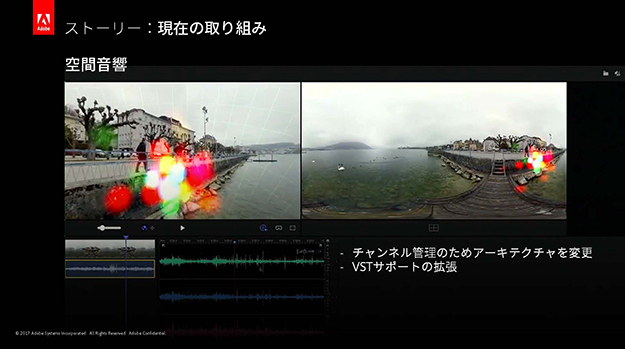Bobotis氏いわく、「人間は見えるよりは聞こえる」。VRはオーディオが大切で、ビデオより大事だという。それに関連して、現在開発中で昨年10月のAdobe Maxで紹介したイマーシブオーディオの制作向けの新機能「SonicScape」を紹介。