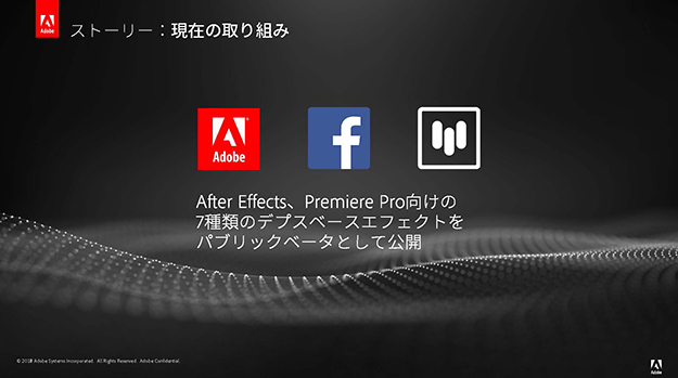 その後、Mettle社はこれまで市場に存在しなかったコア機能を提供するVRの制作向けのプラグインを製品化して発売。ほぼすべての360°コンテンツのプロフェッショナルな制作者が活用するまでに広まる。アドビはMettle社のSkyBox技術を2017年の夏に取得し、イマーシブ対応のアドビ製品は「After EffectsとPremiere Pro、Photoshop、Dimensionの4つ」と名前を挙げた。