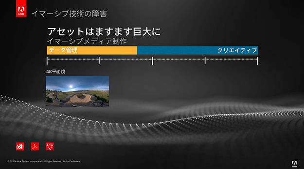 また、FacebookとGoogleがそれぞれ力を入れ始めてアドビも協力しているVR180をサポート。VR180はVR360ほどイマーシブではないが、制作の編集部分の負担がかなり減るので、同じ要素でより深いコンテンツを作れると話した。