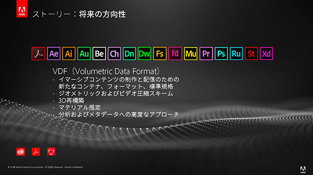 Bobotis氏は「アドビ側でデータの管理の負担を減らして、制作者がクリエイティブの部分をより出せる状況にならないとリアルコンテンツが面白くならない」と指摘。VDFとは、データのフォーマットやコンテナのフォーマットを、アドビが1社ではなく、いろんなパートナーと協力しながらみんなが使えるような標識的なフォーマットを目指したものだと示した。