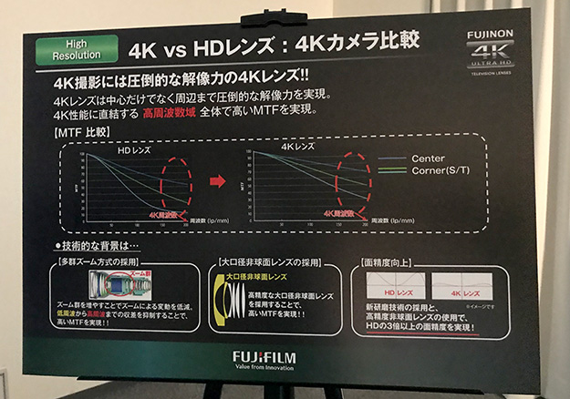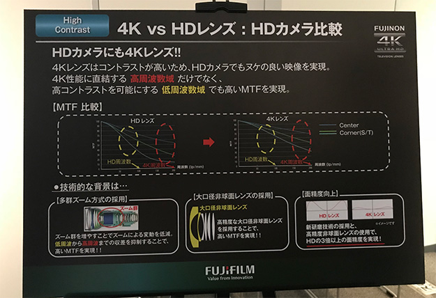 HDカメラにHDレンズ(HA23×7.6)と4Kレンズ(UA24×7.8)をつけて比較。HDカメラに4Kレンズをつけた場合でも画がよくなるといった展示。多群ズーム方式や大口径非球面レンズの採用、面精度向上により、4K性能に直結する高周波数域だけでなく、低周波数域でも高いMTFを実現