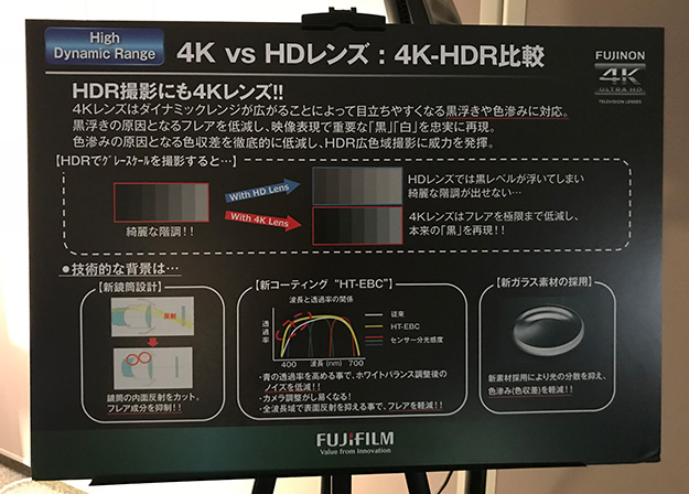 4KカメラでのHDレンズと4Kレンズ(UA24×7.8)比較。UA24×7.8では、ダイナミックレンジが広がることで目立つフレア成分が軽減するように設計されている。また、色滲みもHDRにするとより悪く見えてしまうとのことで、色滲みの原因となる色収差を低減した。鏡胴の内面反射のカットや、青の透過率を高めてホワイトバランス調整後のノイズを低減する新コーティング技術HT-EBCの採用、新素材のガラス採用により光の分散を抑えて色滲み軽減を実現