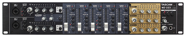 MZ-223は、5系統の入力チャンネルと2系統のマイク入力を、3つのエリアにルーティング可能なミキサー。店舗、公共施設、オフィスなど、複数の再生機器やスピーカーを設置する複雑な音響システムを、本機1台で集中管理することが可能。機能・主な特長は以下の通り。