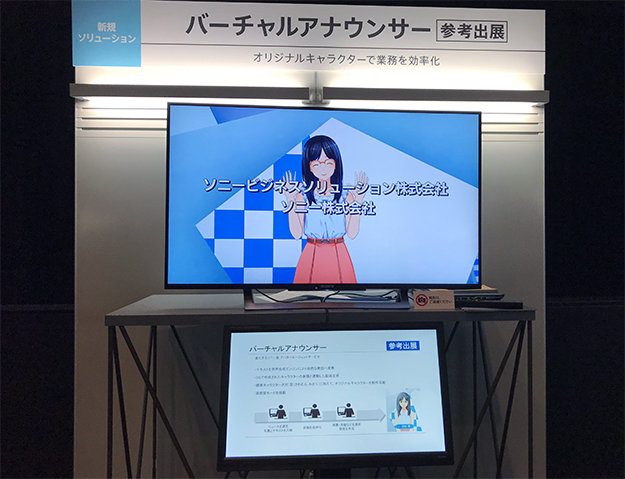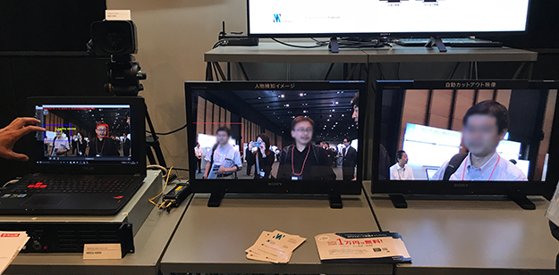 AIを活用した自動化ソリューション。顔認識に基づき、4K映像をHDで自動切り出しが可能。左の4Kモニターで人物を検知した映像を、右のHDモニターで自動カットアウトした映像を展示していた。同ソリューションの活用例としては、AIにゴールシーンなどを認識させ、スポーツ中継でのゴールシーンのダイジェスト映像を自動で生成し、作業時間の短縮・効率化などが挙げられる