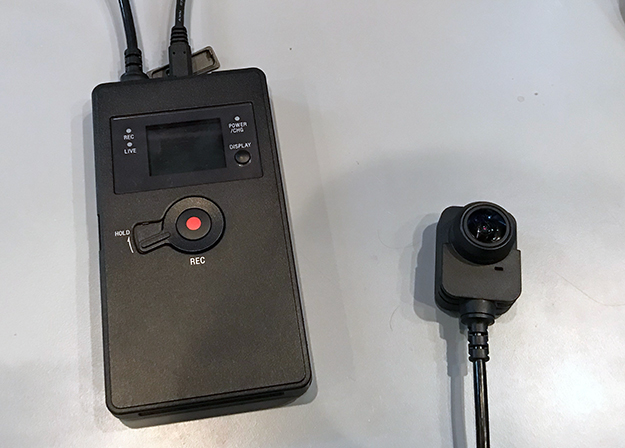 ウェアラブルカメラの本体(左)とカメラヘッド部(右)。暗所性能で被写体をよりクリアに撮影でき、ブレ補正機能搭載を搭載している。年内には発売予定。
