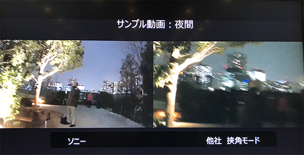 ウェアラブルカメラのサンプル動画比較。左がソニーのウェアラブルカメラとなっており、右の映像と比べると暗所でも明るく、ブレが少ないのがわかる