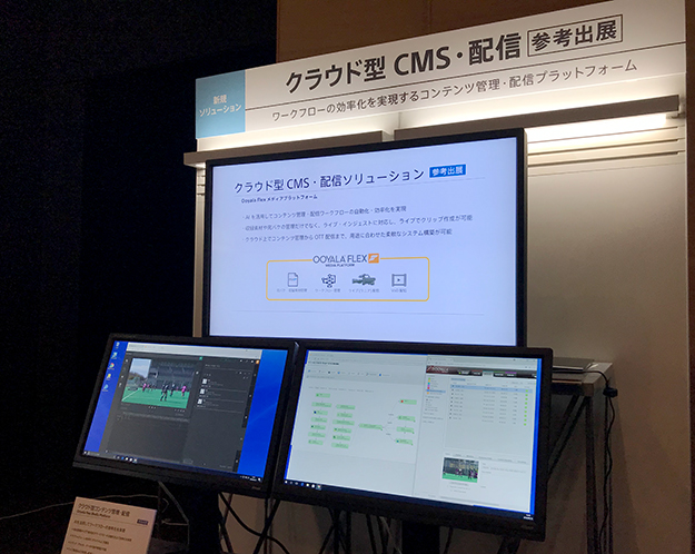 クラウド型CMS・配信として、Ooyala社と一緒に事業を進めている「Ooyala Flex Media Platform」を展示。クラウド上でコンテンツ管理から配信まで可能なOoyalaのエンジンと、自動編集などのAIエンジンを組み合わせることで、今までクラウド上で管理されていたものを、自動でダイジェストに並び替え、配信まで一気通貫で行えないかというところを現在検討中とのこと