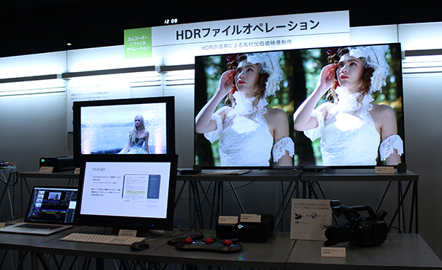 「SR Live for HDRワークフロー」コーナーでは、4K HDR・HD SDRの同時制作を実現するソリューションを展示。HDのVEオペレーションでHDR/SDRの同時制作が可能。S-Log3/BT.2020による4K HDR映像制作も行え、S-Log3の見た目を4K HDR On Air時も再現する「AIR Matching」機能を搭載