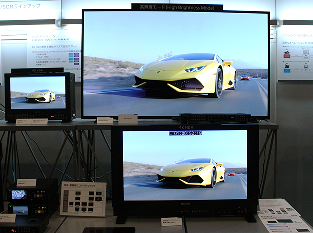 HDR対応モニターBVM-X300/BVM-E171/PVM-X550の新バージョンを展示。BVM-X300(Vre.2.2)/PVM-X550(Vre.2.0)では、一括表示切替や、タイムコード表示、フレキシブルマーカー対応、色温度自動調整ソフトェアVer.1.5への対応、高輝度モードの搭載(X550のみ)などの新機能が追加となった。BVM-E171ではオプションHDRライセンス「BVML-HE171」導入により、ロケや中継車でも最適なHD HDRモニターになるとアピール