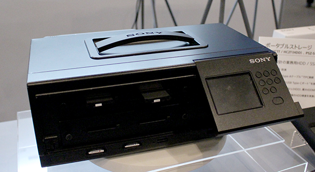 参考出展のPCレスコピーユニット。その名の通りPCを使用せずにロケ先などでデータをバックアップ可能。PCI Express Gen 3に対応しており1TBのコンテンツを約15分でコピーでき作業時間が短縮できる。1回の操作で最大6枚を正副同時コピー可能