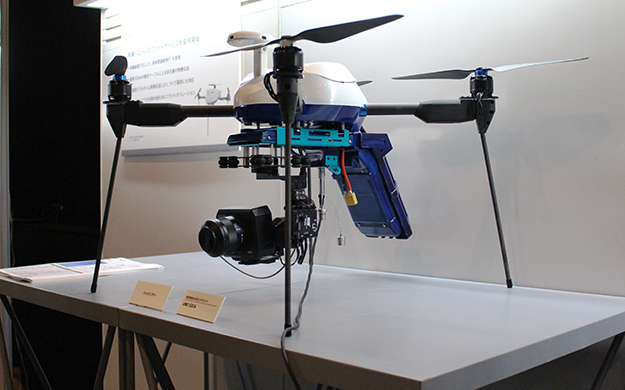 InterBEE2017で参考出品されていた有線ドローン。近日、機材とオペレーターを1イベント単位で提供するフライトサービスを開始予定(エアロセンス株式会社と提携し、ソニーグループとしてサービスを提供)。有線ドローンは光ファイバーケーブルによる有線給電を行っており、連続6時間の撮影が可能。また、給電を行いながら映像を送り返しているので、リアルタイムに映像を確認でき、監視用途や災害時のモニタリング用途に適している