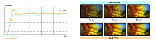ムラ補正回路による均一なユニフォーミティの均一化を実現。画面全体の何百もの小区域を、自動的に細部まで輝度を微調整する。輝度制御により、電源を入れた後、数分以内に最適な輝度になるようバックライトが調整され、安定状態までわずか5分だとしている。短時間の使用でも、購入から製品寿命までの長期間使用でも、一定の輝度を維持するように設計されている。
