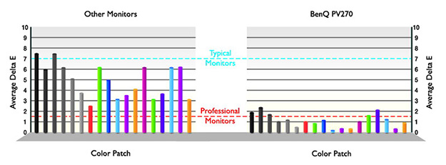 14-bit 3D LUTにより、正確な色とグラデーションを表示可能。RGBの加法混色性能を向上させる14-bit 3D LUTを採用したことで、グレー階調を含め厳密な色再現が可能となった。また、Rec.709とAdobe RGBの両方の色空間で平均デルタE≤1.5を満たし、映像およびグラフィック編集のプロセスで正確な色を提供するとしている。デルタE≤1.5では、オリジナル画像の本来の色を映し出すだけでなく、最初に画像を照合した段階で信頼性の高い有望な色彩を実現する。