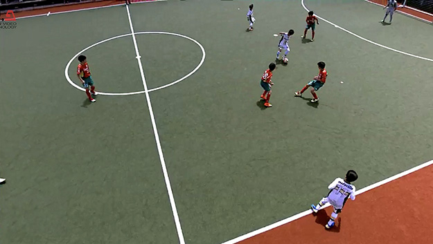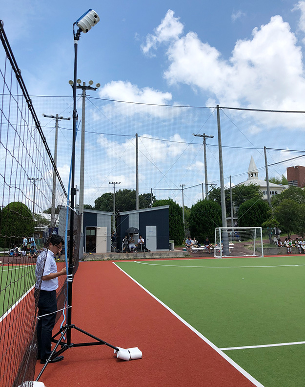 オートマチックスポーツプロダクションシステムを搭載したAIカメラシステム「ピクセロット」。ピクセロットを用いることでコートをパノラマ撮影。フットサルのプレイを自動追従し、切り出しズーム、プロ並みのカメラワークを実現し、従来カメラマンが行ってきた作業をAIカメラシステム1台で代替する。