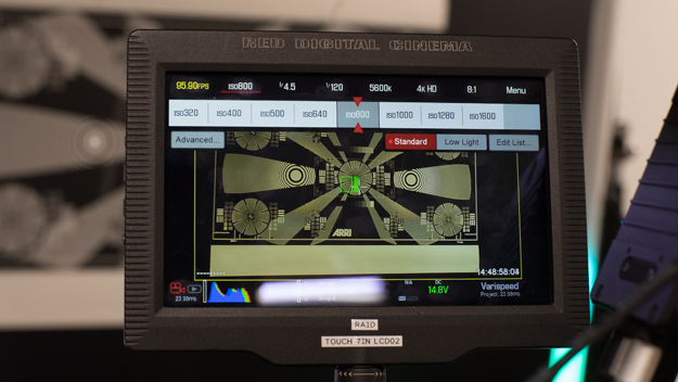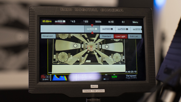 REDのGEMINI 5K S35は、デュアル感度モードの搭載が特長だ。ISO800が基準のStandardモードとISO3200が基準のLow Lightモードの2つの感度を持っている。StandardモードやLow Lightモードの切り替えや感度の切り替えはタッチパネルで可能。Low Lightモードを使えばこれまでのRED社のカメラでは実現できなかったISO10000以上の撮影に対応可能となる。