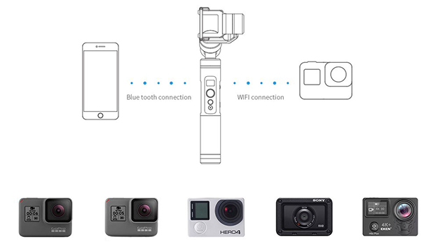 G6は、カメラをWi-Fiで接続することによってジンバル本体でカメラを操作可能。録画の開始、画角、画素数の調整などの一連の操作をジンバルのハンドルから行うことができる(対応機種はGoPro Hero6/5/4、Sony RX0など)。また、スマートフォンアプリ「FeiyuON」により、遠隔操作やムービングタイムラプス設定も可能。