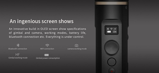 ジンバルのハンドル部にはスクリーンがついており、バッテリー残量、ジンバルのモード、カメラのモードなどを確認可能。今までにあったジンバルを使った撮影での煩わしさを取り除き、よりカメラと一体で使えるように設計しているという。