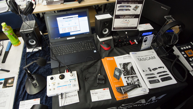 TASCAMブースは番組の効果音や一人で質の高いパーソナル放送を実現するためのオーディオインターフェイスを展示