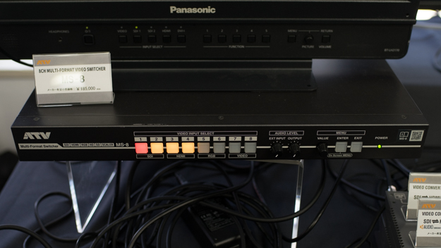 「MS-8」は、設備用途向けのスイッチャーでラックマウントを採用。8入力に対応し、SDI2系統、HDMI2系統のほかに、古いタイプのパソコンに対応するアナログRGBやコンポジットのビデオにも対応する。内蔵スケーラーにより、すべての映像入力信号を最適なフォーマットに自動変換する。想定用途は、会議室など複数の人が出入りするところで、あらゆるものを繋げることを想定している。