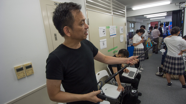 高校放送機器展の出展社ではないが、モバイルVRプラットフォームを開発するワンダーリーグの代表、北村勝利氏が会場で3Dアバター操作・配信システム「アニコン」をデモしていた。ライブ配信が流行っているが、顔出しをしたくない。そこで、アイドルや第三者になりきって、YouTube、Facebook、Twitterへのライブを可能にするものだという。