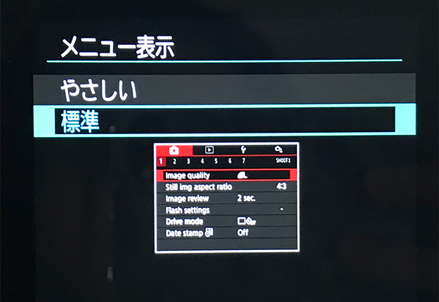 メニュー表示はコンパクトデジタルカメラ風UI(やさしい)と、EOS風UI(標準)の2パターン