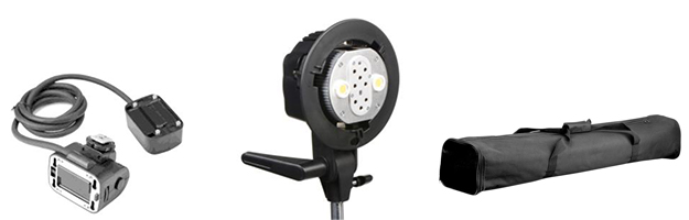 左からAD200用エクステンションフラッシュヘッドEC-200、デュアルパワーフラッシュブラケットAD-B2、ライトスタンドキャリングバッグCB-03