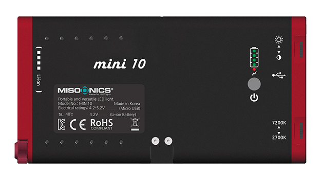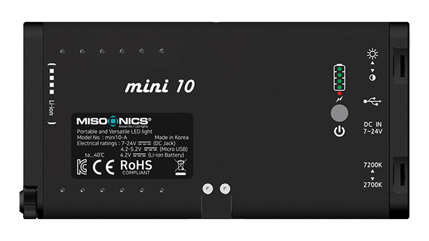 バッテリー式のmini10と、バッテリー/外部入力兼用のmini10-Aの2タイプ。最大出力は10W、60cmで1008lux。色温度は2700~7200K、演色性は95以上、照射角は110°以上。ハウジングにはAL60系列のアノダイジングアルミニウム合金を採用し、220gと軽量で、本体も14mmと薄い。バッテリーはサムスン社製の3,300mAの交換可能な大容量バッテリーを内蔵。USB端子経由で充電も可能。またmini10-Aはバッテリーの他、DC7-24Vの外部電源入力にも対応している。主な仕様は以下の通り。
