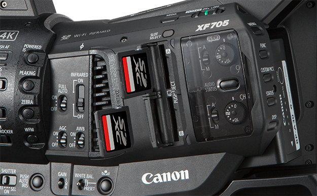 キヤノンは、4K(3840×2160)60P 4:2:2 10bit HDR映像をSDカードに記録可能な業務用4Kビデオカメラ「XF705」を2018年11月下旬に発売する。希望小売価格はオープン。同社オンラインショップでの販売予定価格は税別778,000円。
