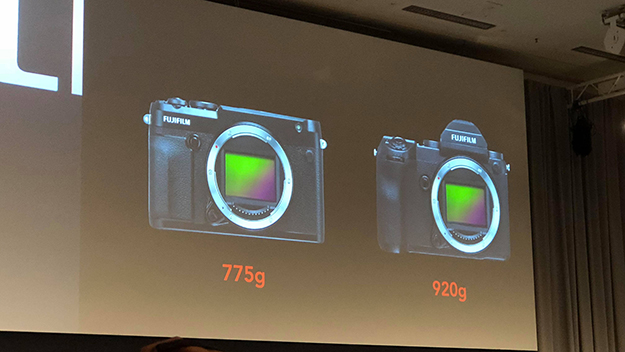 「GFX 50S」よりも約145g軽い775gの軽量ボディを実現。ボディの厚みも最薄部46mmと薄型化したことで、携帯性と収納性を高めたとしている。