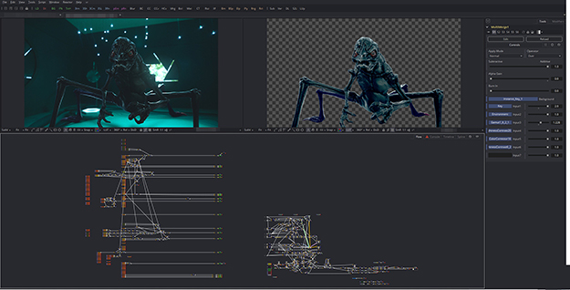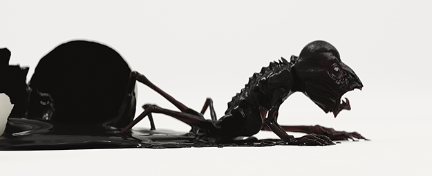 レイ氏:生まれたばかりの「妄想」は黒い粘液に覆われているため、動くたびに跡が残ります。そこでFusion Studioを使用して、その跡を作成する方法を考案しました。「Ambient Occlusion(アンビエントオクルージョン)」を使用し、モンスターの脚が地面に触れた場所のレンダリングからのデータを用いて、「Trails」ツールで、次の一歩に踏み出た後にも跡がしばらく残るようにしました。その後、カスタム・マクロを使用して、それらの跡にボリュームを加え、反射するようにしました。