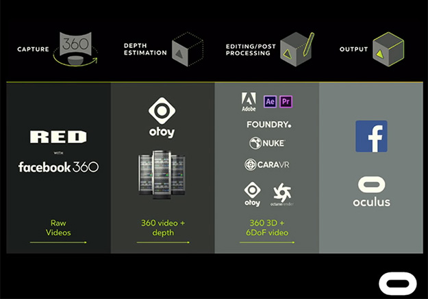 360°/VRコンテンツ制作はポストワークフローであり、Facebook 360とREDは、Adobe、Foundry、そしてOTOYと提携し、ワークフローを最適化して効率化し、配信までのシステムを実現する。