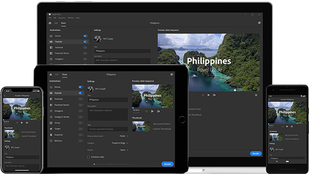 また、Adobe Senseiによる、ワンクリックでBGMの音量を調整する自動ダッキング機能も装備。どこからでもアクセス可能で、デスクトップとモバイルを横断して一貫性のあるユーザーエクスペリエンスが提供される。ひとつのデバイス上で作成したプロジェクトを異なるデバイスから、対象のソーシャルプラットフォームに最適化されたフォーマットで投稿することもできる。