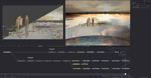 このシーンは、グリーンバックのスタジオで撮影された。また、出演者や蓮の水面の反射をオンセットで撮影するため、浅いプールがセット内に作られた。そしてポストプロダクションの目的は、実写のプレートに溶け込む、説得力のある幻想的なセットを作り込むことであった。水面のリアルな反射を作成するため、コリシェフ氏はFusionの3D作業空間を活用し、シーンを合成した。